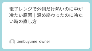 電子レンジで外側だけ熱く中が冷たい原因は、加熱ムラ、回転皿/置き位置、食品の厚みや水分ムラ、蒸らし不足、容器の熱保持、自動あたための早止まりなど。中央置き→向き替え→混ぜる→低ワット2段階→蒸らし30秒〜1分の順で改善できます。
